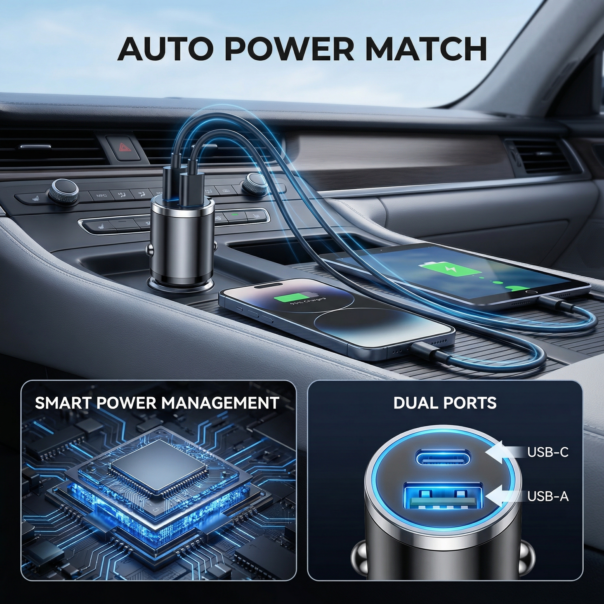 Equipped with USB-C PD and USB-A QC 3.0, this car charger intelligently adjusts power output to deliver efficient, fast charging for compatible devices—saving time and keeping you connected.